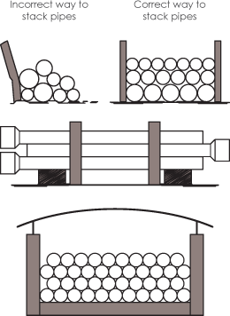 | Ideally a stack should contain pipes of the same diameter. If this is not possible nesting of smaller pipes inside the large pipes may be done. The large diameter pipes should always be kept at the bottom of the stack. |